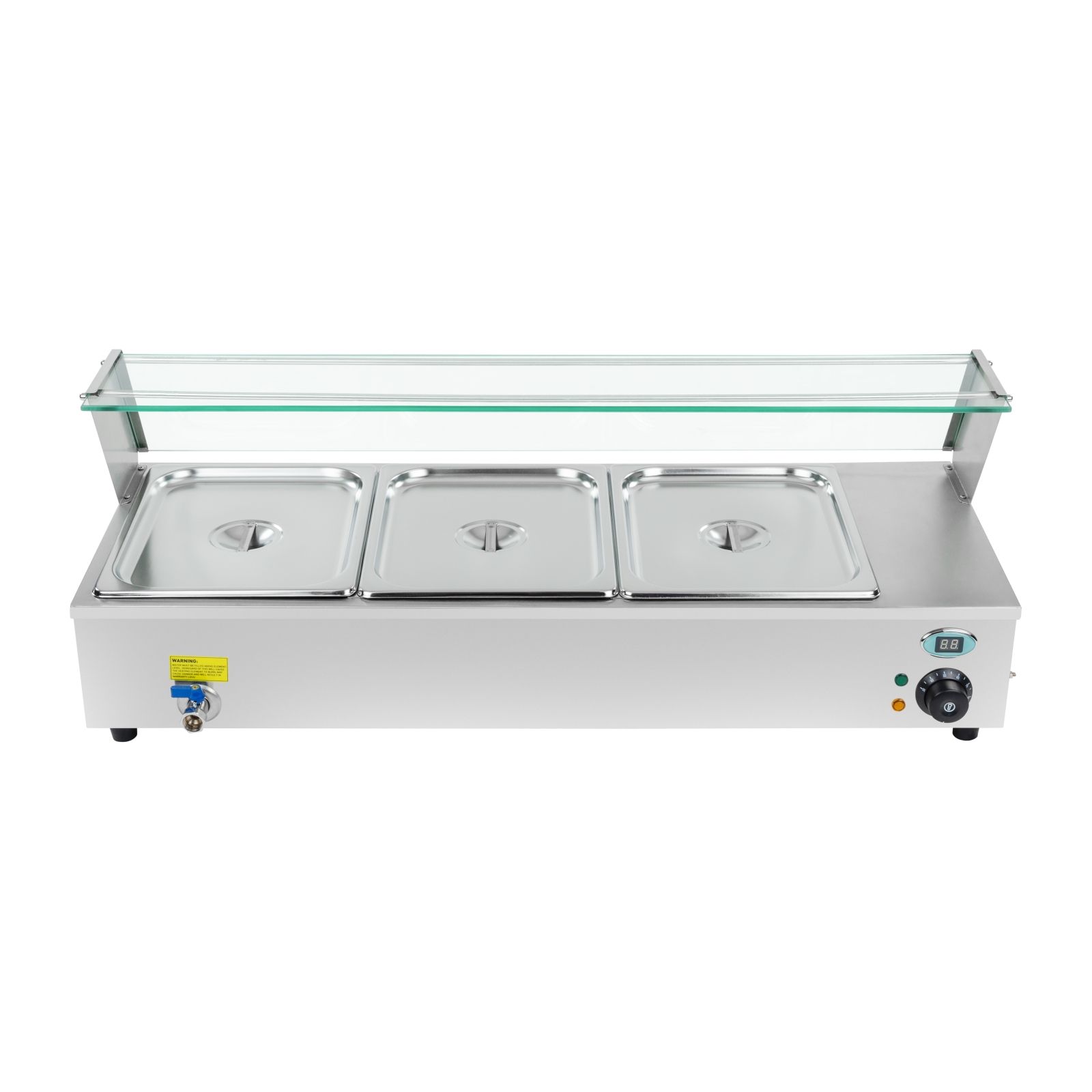 A Royal Catering RCBM-3 Bain Marie ideális az ételek melegítésére. Automatikus termosztáttal és védőüveggel rendelkezik. Kiváló minőségű víztartályokkal és leeresztő csapokkal rendelkezik, amelyek megkönnyítik a tartályok feltöltését és kiürítését.