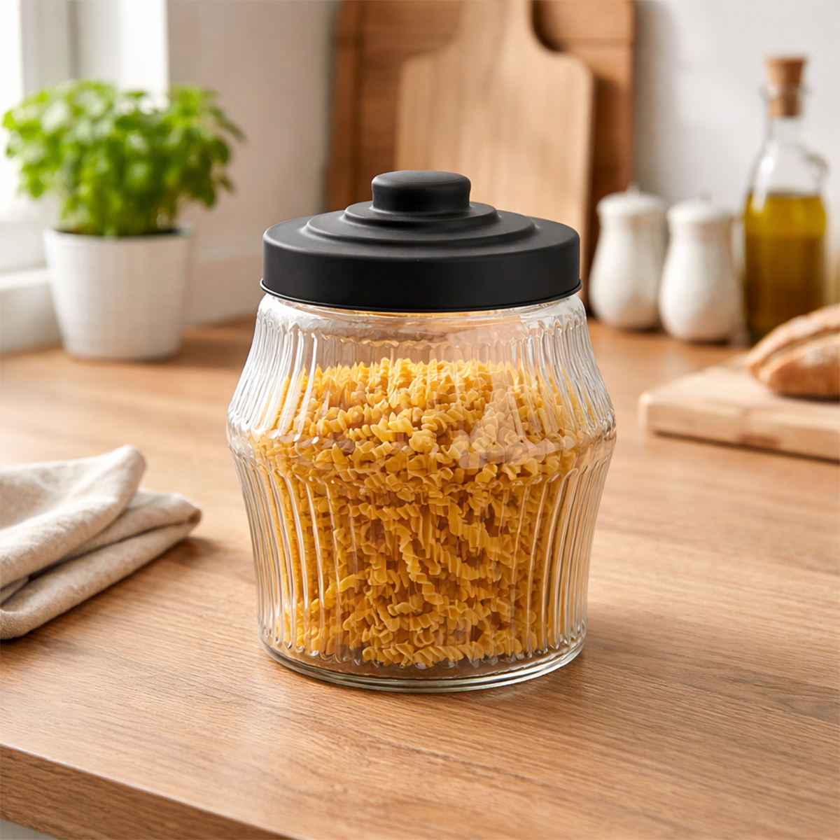 A 2 literes bordázott üvegtároló fedéllel stílusos és praktikus kiegészítő minden konyhába és kamrába. Ideális tészta, rizs, fűszerek, hüvelyesek, méz és más alapanyagok tárolására. A fekete fémfedél elegánsan egészíti ki a tároló megjelenését, miközben segít megvédeni a tartalmát tárolás közben. Bordázott kialakításának köszönhetően dekoratív hatású, és könnyen illeszkedik modern és klasszikus enteriőrbe is.