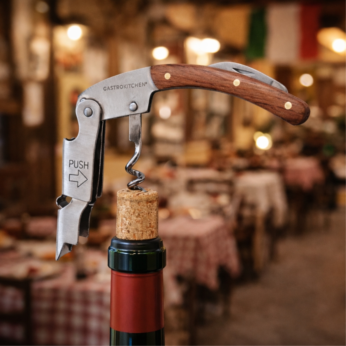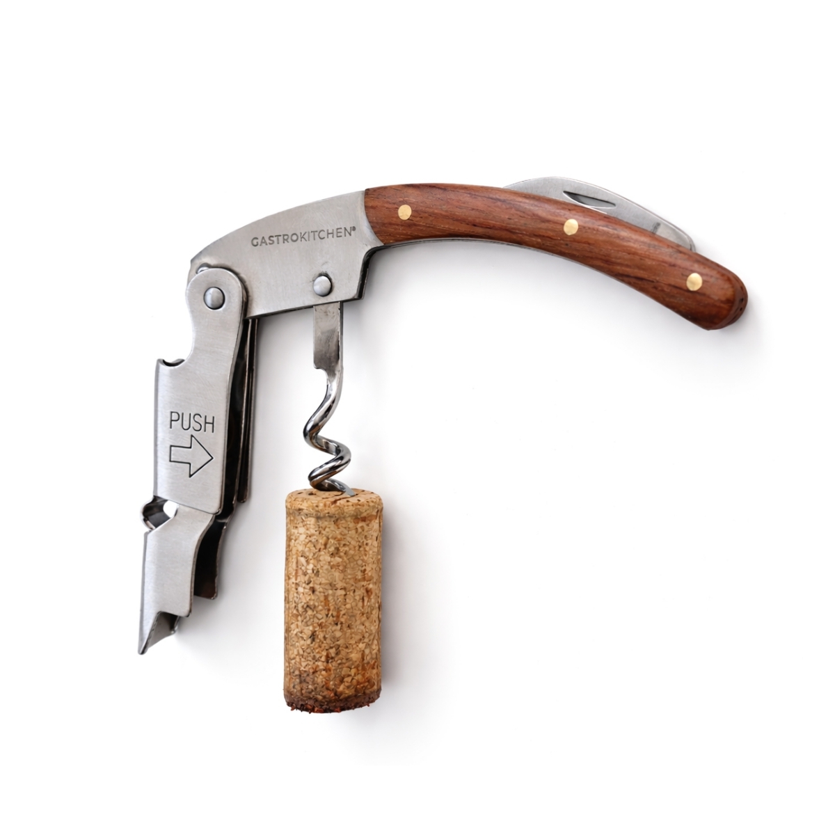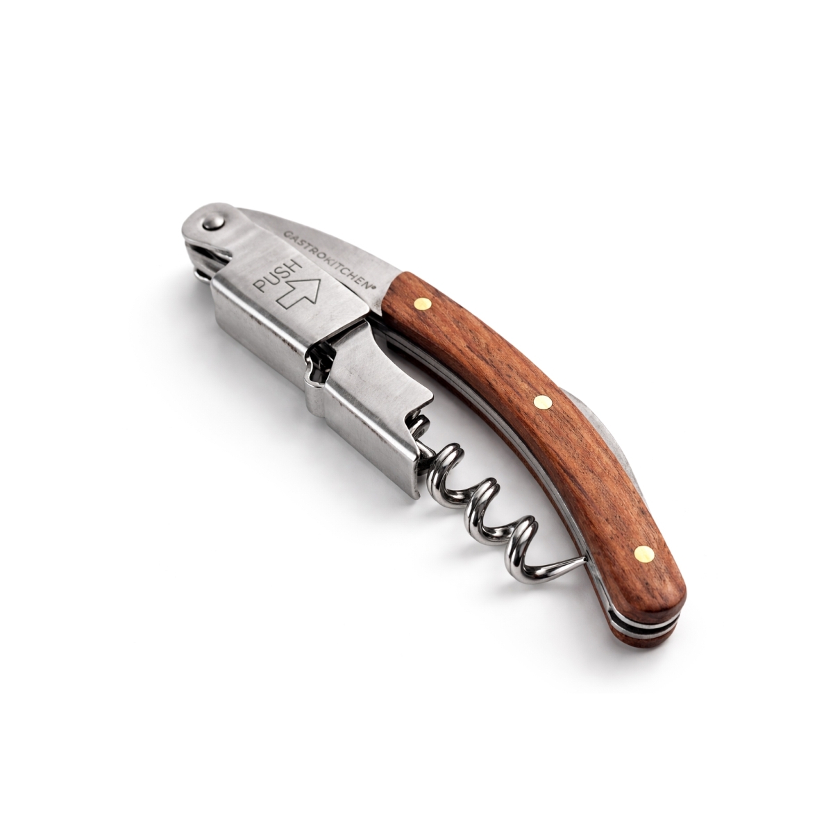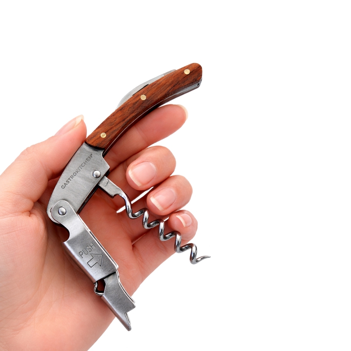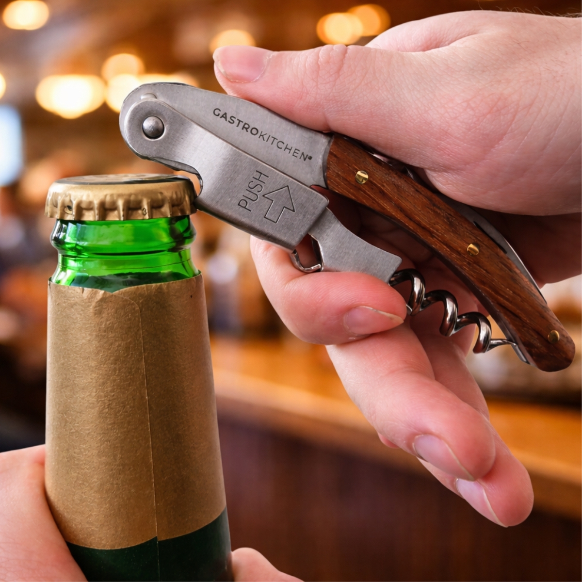 A fa nyéllel ellátott praktikus bornyitó megbízható segítőtárs a borosüvegek egyszerű és gyors kinyitásához vendéglátóipari egységekben és otthon is. A kompakt, összecsukható kialakítás kényelmes használatot, valamint egyszerű tárolást és hordozást biztosít. A praktikus kivitel része egy beépített sörnyitó is, így ez egy univerzális eszköz a mindennapi használathoz.