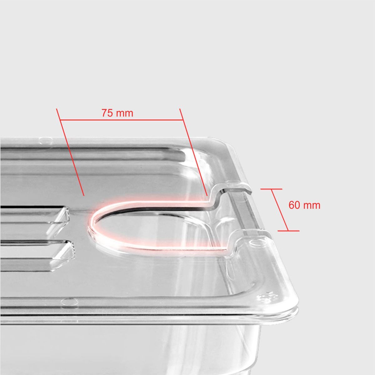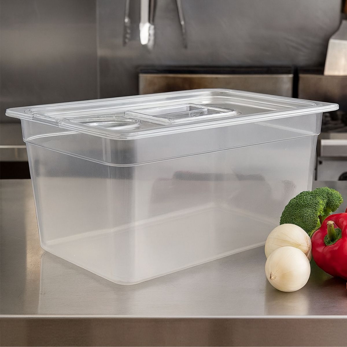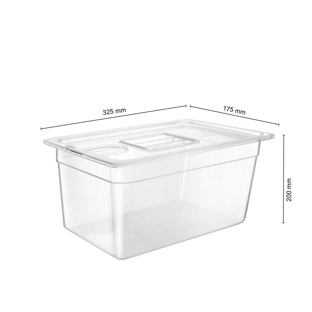 A polikarbonát anyag élelmiszerbiztonságos, ütésálló és hőmérséklet-változásnak ellenálló. Hűtőszekrényben, pultban vagy ételszállításra is alkalmas. Az átlátszó kivitel megkönnyíti a tartalom ellenőrzését anélkül, hogy fel kellene nyitni.