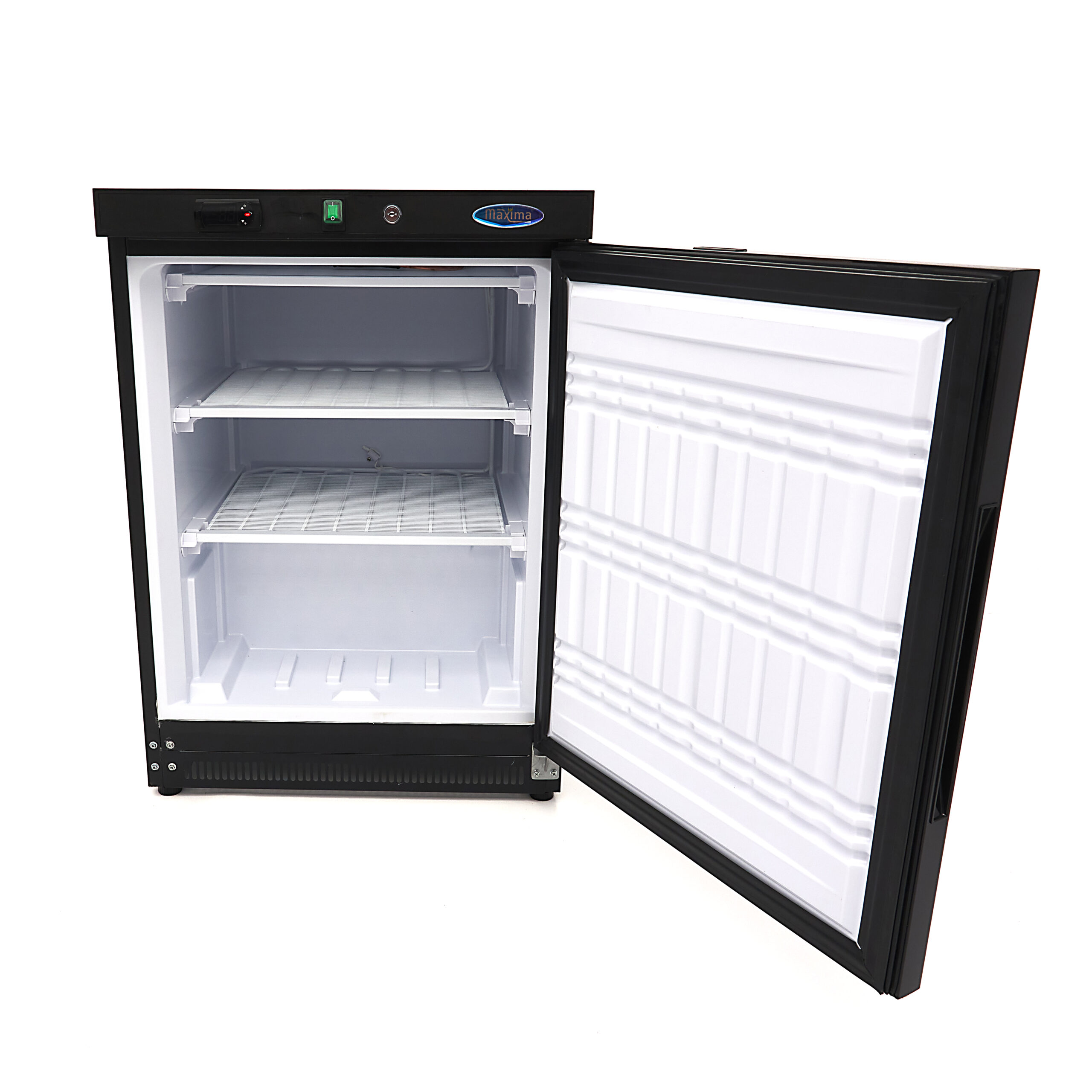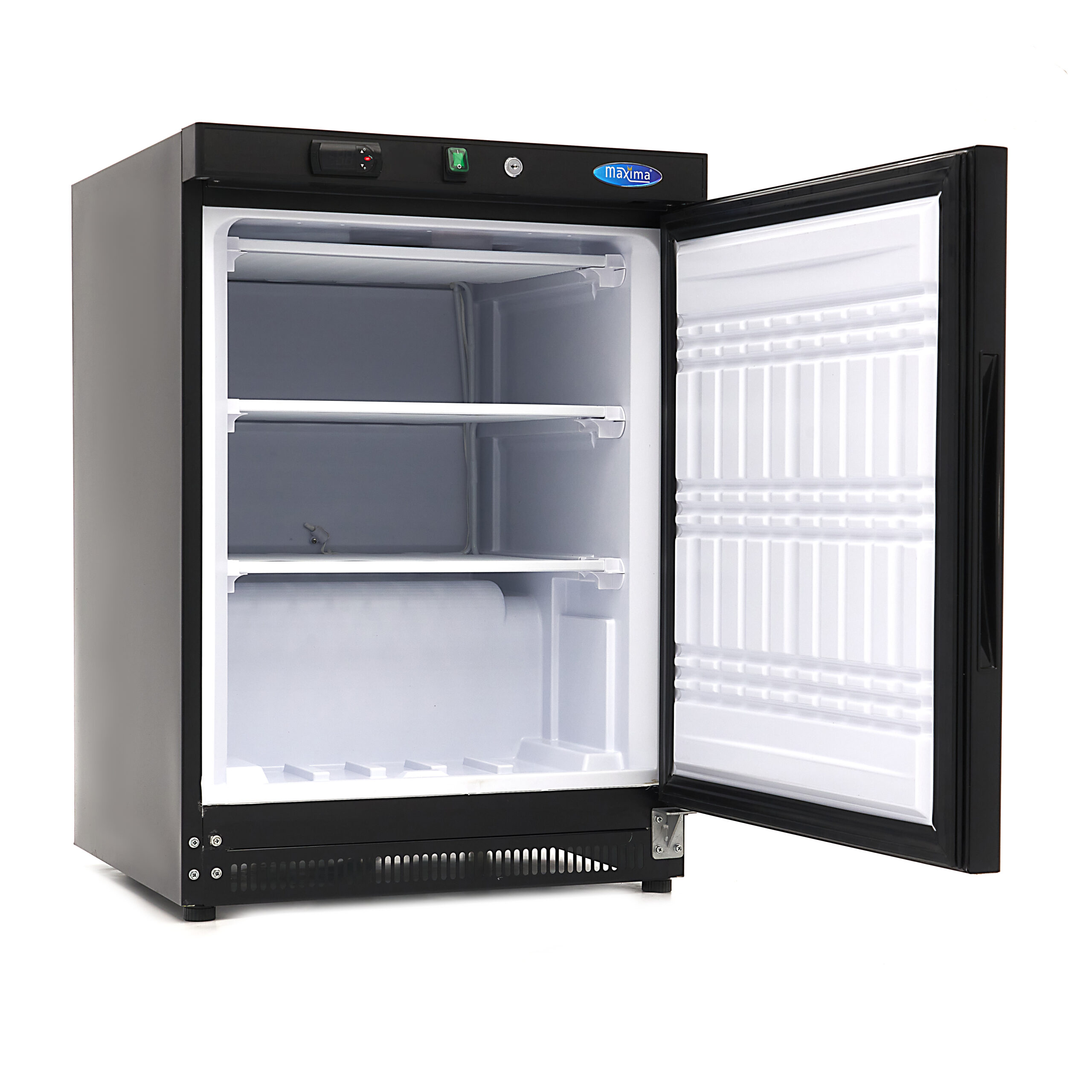 Fagyasztószekrény – 200 L – 2 fix polc – fekete | Maxima 09405003 bruttó térfogata 200 l. Két fix polccal rendelkezik, amelyek egyenletes felületelosztást biztosítanak a termékek szükségig történő fagyasztva tartásához.