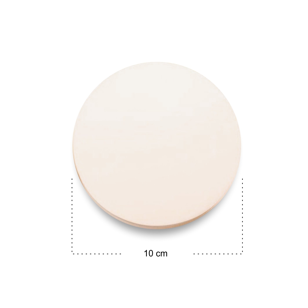 A lapok átmérője 10 cm, anyaguk cellulózpapír, 42 gsm grammsúllyal, ami optimális szilárdságot és higiénikus élelmiszerkezelést biztosít. A fehér szín tiszta, profi megjelenést kölcsönöz.