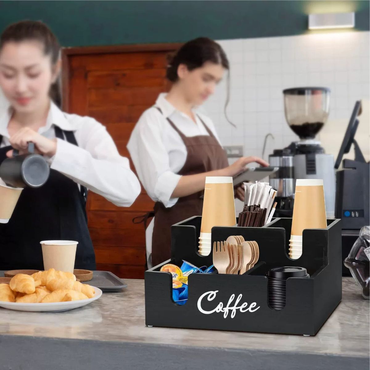 Az organizálót mindennapi használatra tervezték vendéglátóipari környezetben. A jól átgondolt rekeszkialakítás gyors utántöltést és kényelmes hozzáférést biztosít a kávé és meleg italok készítésekor. A masszív fa szerkezet stabilitást és hosszú élettartamot nyújt intenzív igénybevétel mellett is.