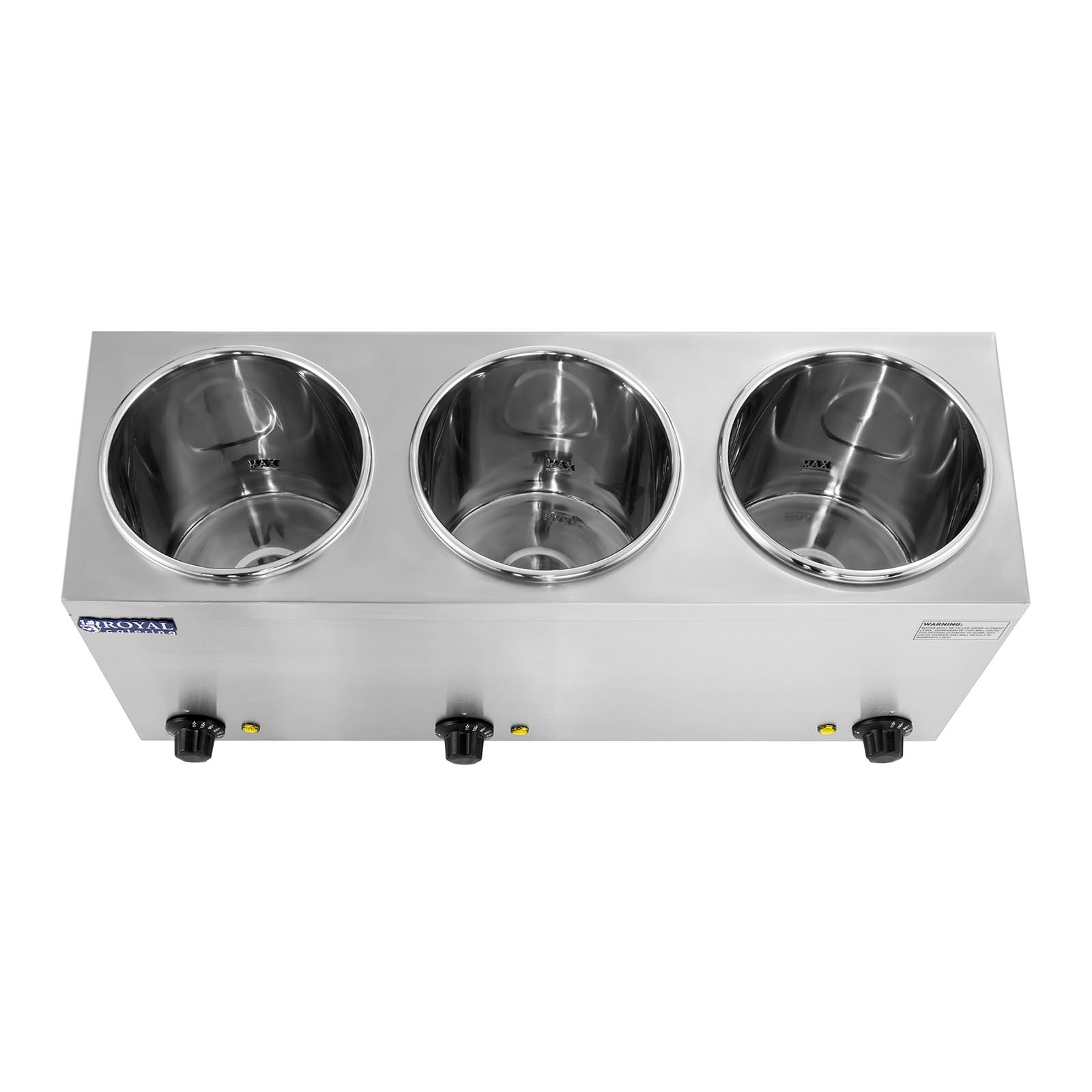 A Levesállomás – 3 x 2,75 l – 450 W | RCBM-3/4R a gyártó Royal Catering cégtől a gasztronómia professzionális használatára készült, és praktikus segítője az ételek állandó hőmérsékleten tartásának az Ön éttermében, gyorséttermében, bisztrójában vagy leveses konyhájában. A levesállomás megbízhatóan tartja a klasszikus és sűrű levesek vagy mártások állandó hőmérsékletét.
