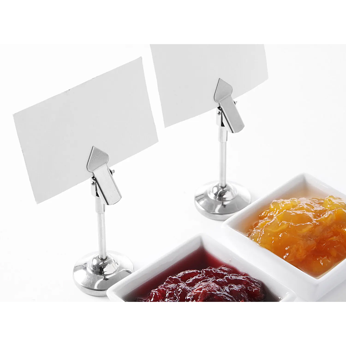 A menütartó állvány – Ø 40×104 mm – 2 db | Hendi 595305 praktikus, rozsdamentes acél állvány, amelyet névtáblák, asztalszámok, kis menükártyák vagy árcímkék kihelyezésére terveztek. A stabil, kerek talp biztosan áll az asztalon, visszafogott, elegáns kialakítása pedig bármely vendéglátóegység enteriőrjébe jól illeszkedik.