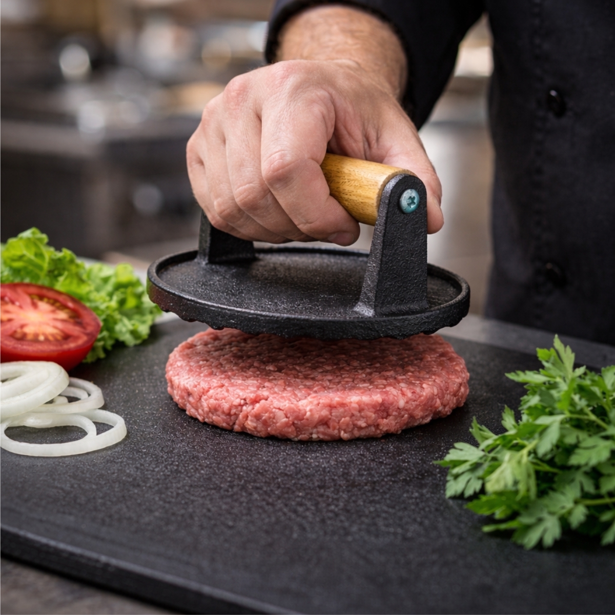 - Minőségi öntöttvas prés hamburgerekhez, húsokhoz és más grillezett ételekhez