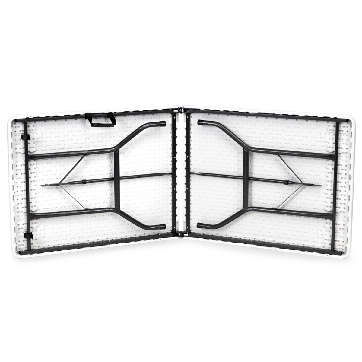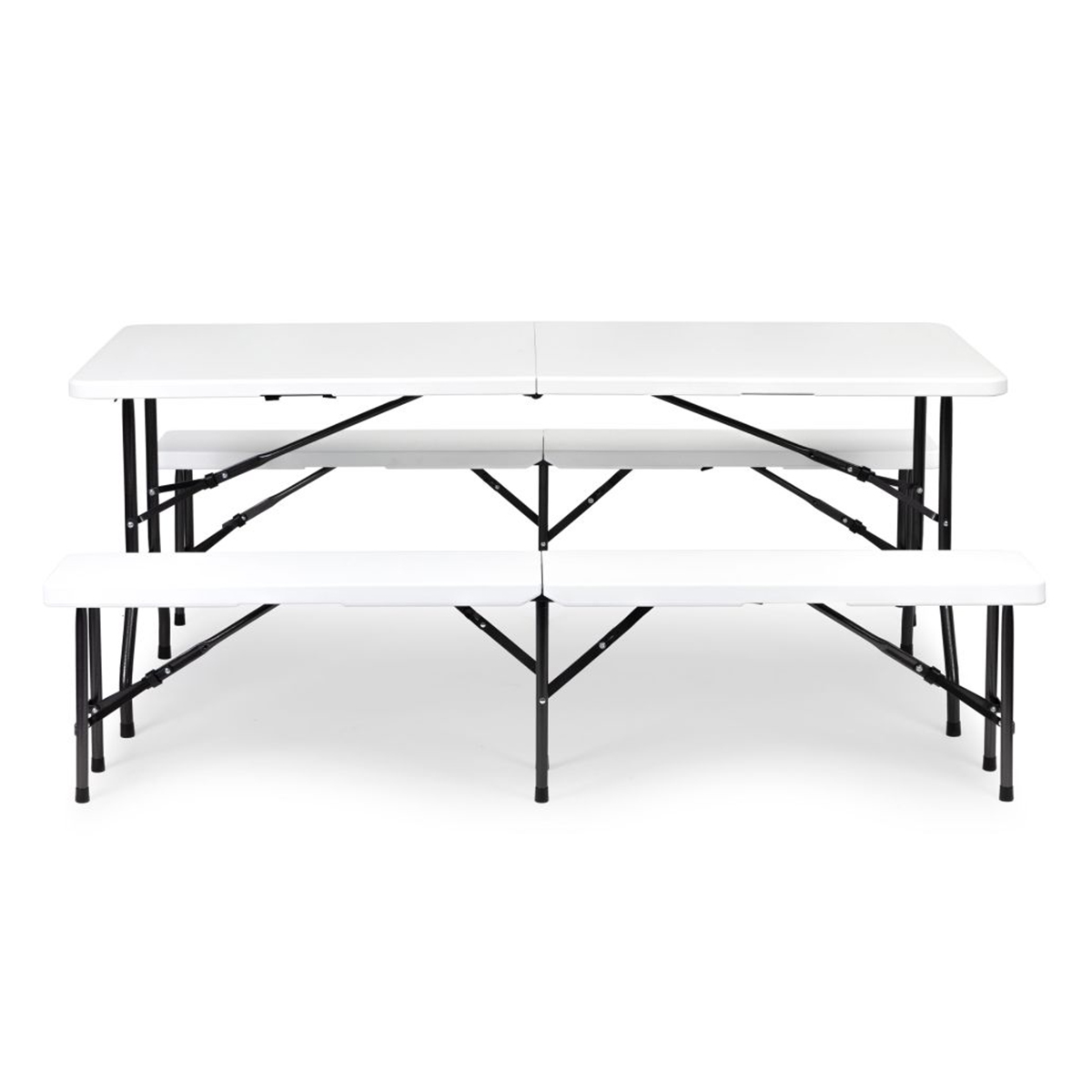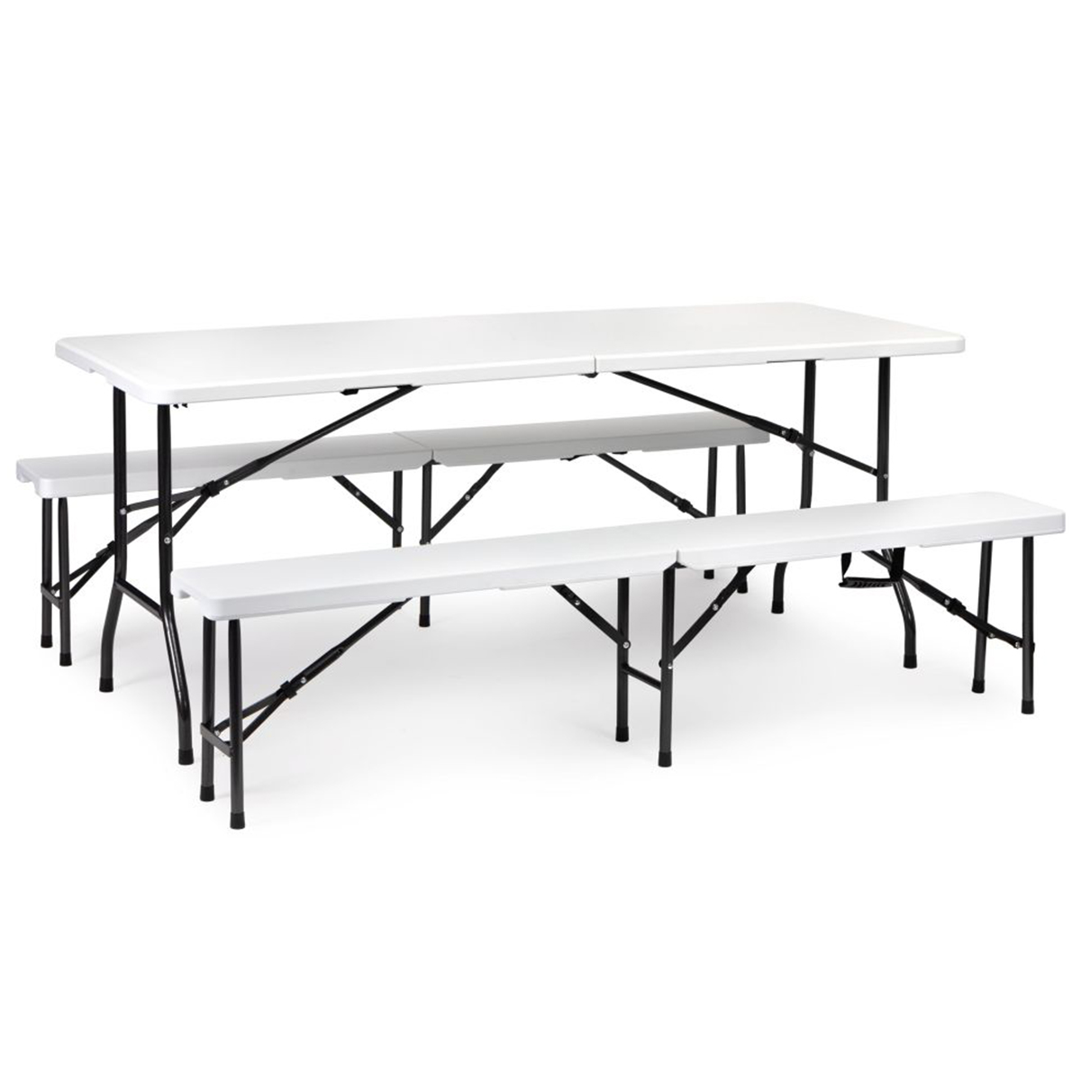 A kerti étkezőgarnitúra tökéletes választás azoknak, akik értékelik az egyszerűséget és a funkcionalitást. Ideális szabadtéri rendezvényekre, banketttermekbe, éttermekbe vagy otthoni használatra. A bútor porszórt acélszerkezettel és rendkívül erős és vastag műanyag lemezekkel rendelkezik , így ellenáll a kedvezőtlen időjárási körülményeknek Az asztal akár 8 fő befogadására is alkalmas. Összecsukva a bútor alkalmas szállításra és tárolásra . Elfér az autóban és nem foglal sok helyet a garázsban vagy a padláson.