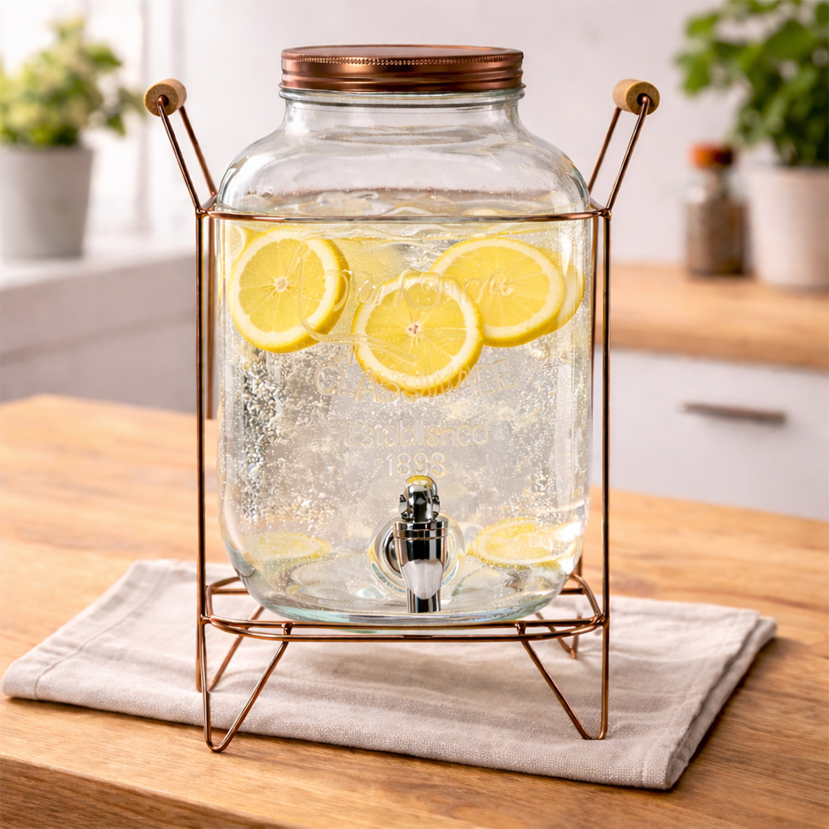 Az Üveg italadagoló – 5 L állvánnyal praktikus és elegáns megoldás hideg italok felszolgálásához vendéglátóhelyeken és otthoni használatra is. Az 5 literes űrtartalom lehetővé teszi víz, limonádé, gyümölcslé és más italok hatékony kínálását, ritkább utántöltéssel. A masszív, átlátszó üveg tartály és a stabil fém állvány nagyfokú tartósságot biztosít mindennapi használat mellett is.