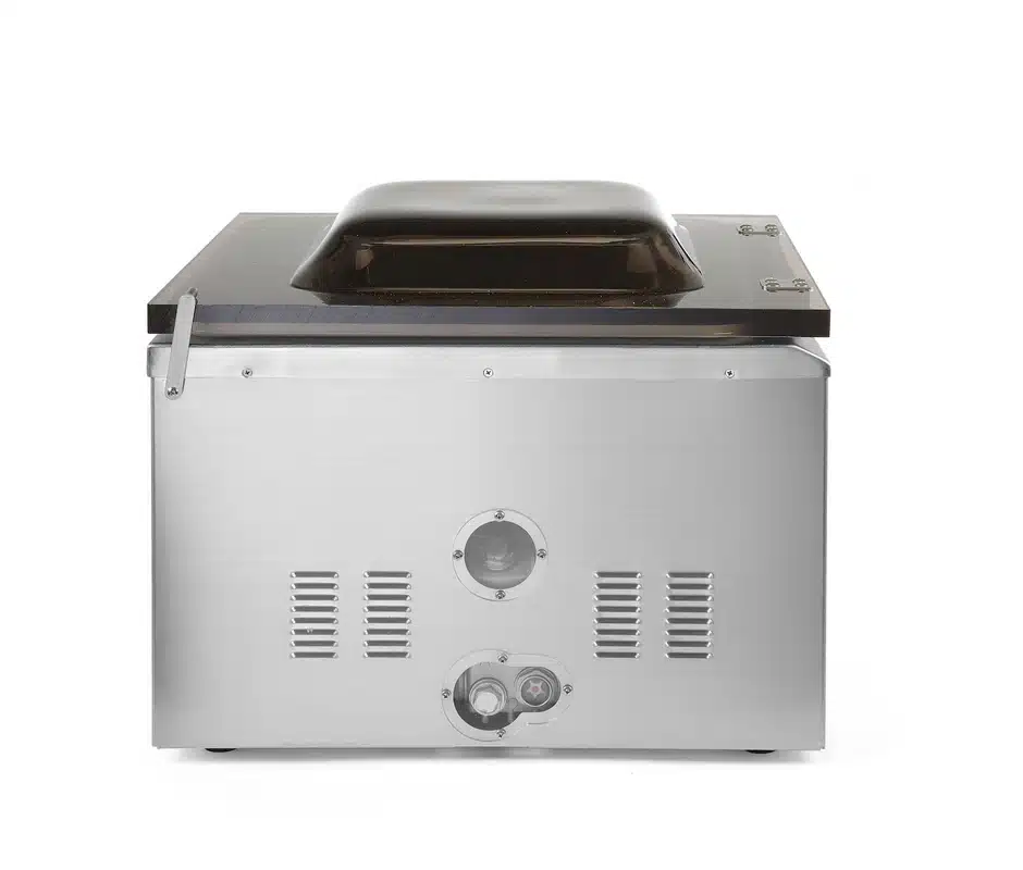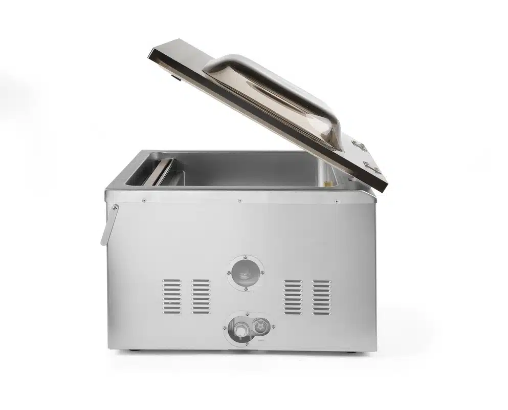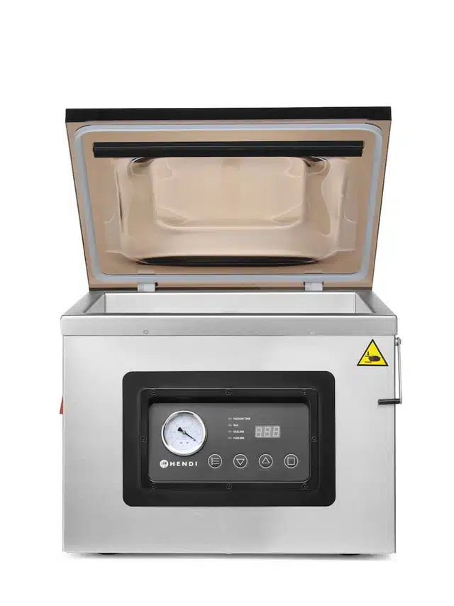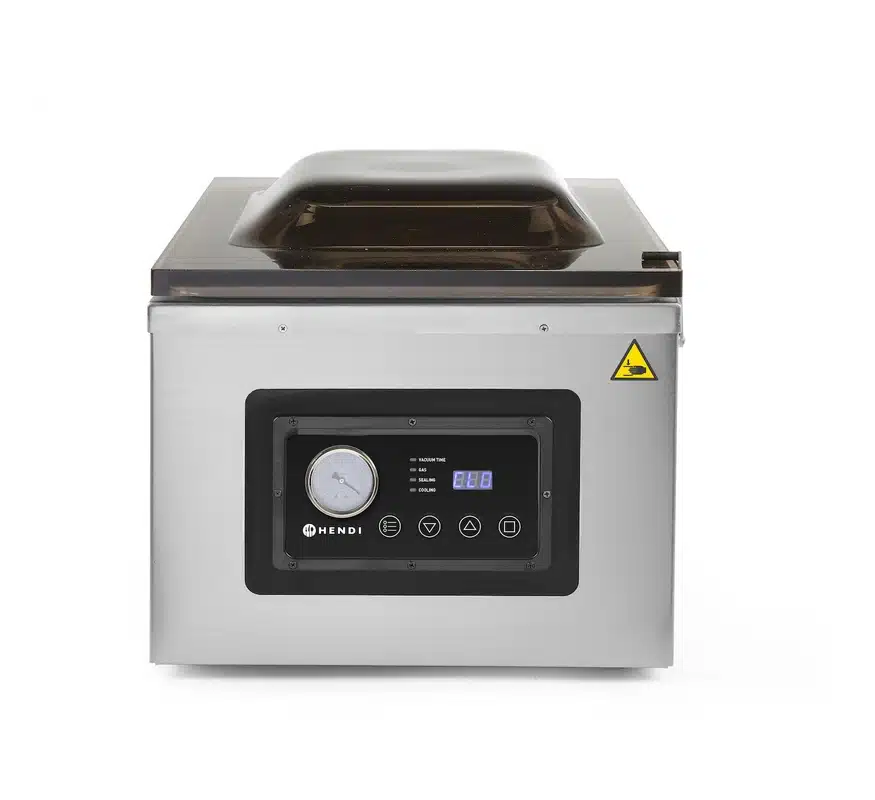 A vákuumcsomagoló gép – kamrás – 410 mm | Hendi 201442 egy funkcionális gép, amelyet számos iparágban használnak. Különösen hasznos a gasztronómiában és a háztartási konyhákban az élelmiszerek hermetikus csomagolásához.